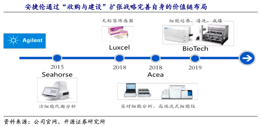 經(jīng)典案例:根據(jù)公司官網(wǎng)、開(kāi)源證券研究所等綜合資訊表明,安捷倫通過(guò)“收購(gòu)與建設(shè)”的發(fā)展戰(zhàn)略,不斷完善自身的價(jià)值鏈布局、提升自己的全球影響力。2010年,安捷倫收購(gòu)儀器制造公司 Varian, 增強(qiáng)了自身在化學(xué)分析儀器方面的業(yè)務(wù)深度,并正式進(jìn)入生命科學(xué)領(lǐng)域,并通過(guò)對(duì)其核磁共振業(yè)務(wù)的整合成為全球三大核磁供應(yīng)商。