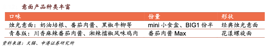 經(jīng)典案例:根據(jù)天貓、申港證券研究所等綜合資訊表明,空刻持續(xù)在研發(fā)端發(fā)力,圍繞“意面”做系列化產(chǎn)品,包括口味的創(chuàng)新和意面形 狀的變化,以期滿足各類潛在客戶的需求。如空刻于2022年推出新品 mini 小食盒, 主打小餓小饞無負擔(dān),開拓了宵夜新場景,并打造空刻意面青春版系列,將川湘兩地標(biāo)志性辣味與意大利面進行融合創(chuàng)新。