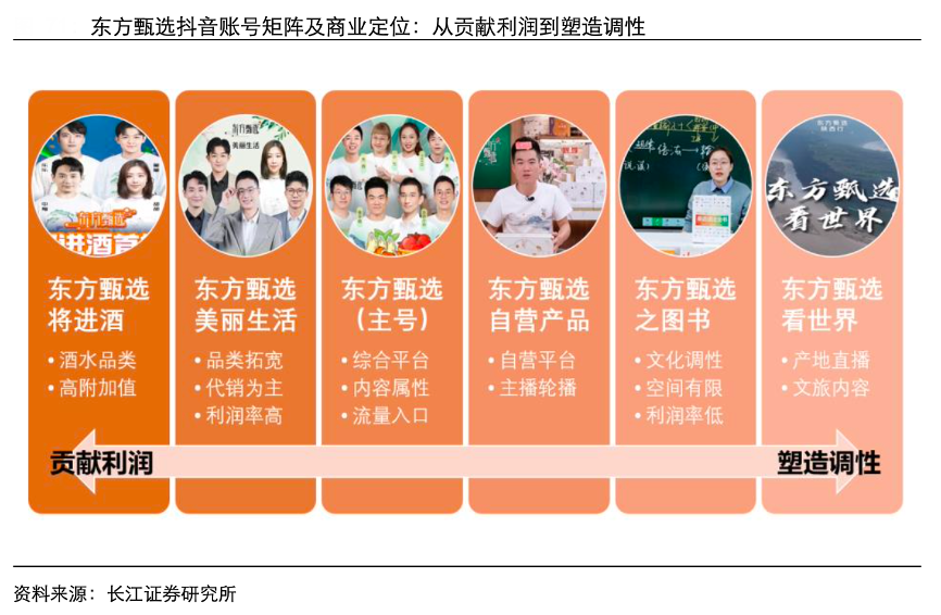 經(jīng)典案例:根據(jù)長江證券研究所等綜合資訊表明,“東方甄選”品牌目前下設(shè) 7 個抖音直播間,組合構(gòu)成公司戰(zhàn)略的目標(biāo)利潤率與調(diào)性風(fēng)格平衡。大體來說,貢獻(xiàn)利潤的是將進(jìn)酒、美麗生活兩個賬號,代銷傭金將直接確認(rèn)為收入;塑造調(diào)性的是看世界、圖書兩個賬號,執(zhí)行創(chuàng)始人推崇的“讀萬卷書,行千里路” 理念,但品類天花板與利潤率水平相對低;主號享受最大的流量基礎(chǔ),作為綜合平臺兼 顧商業(yè)與文化雙重屬性,為其他矩陣號宣傳引流。