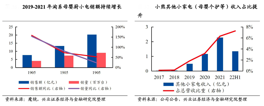 經(jīng)典案例:根據(jù)魔鏡、公司公告、興業(yè)證券經(jīng)濟與金融研究院等綜合資訊表明,2019-2021 年母嬰廚房小家電品類淘系銷額分別同比 +157.9%/+72.8%/+52.5%,銷量分別同比+153.3%/+81.0%/+23.2%。小熊公司萌系品牌定位及高性價比產(chǎn)品與母嬰用品的使用體驗要求及快速迭代較為契合,公司其他小家電(主要為母嬰及個護(hù)品類)營收占比逐年提升,2021 年末成立母嬰事業(yè)部,個護(hù)事業(yè)部組織升級,制度化保證新品類持續(xù)投入。