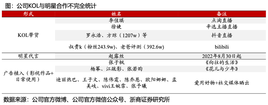 經(jīng)典案例:根據(jù)公司官方微博、公司官方微信公眾號(hào)、浙商證券研究所等綜合資訊表明,蕉下擅長(zhǎng)通過(guò)KOL組合投放+明星代言營(yíng)造產(chǎn)品高話(huà)題度,21年合作超600位KOL(199位粉絲超百萬(wàn),除合作包括李佳琦、羅永浩在內(nèi)的頂級(jí)頭部KOL外,亦包括大量中腰部KOL)。間接影響14億粉絲,帶來(lái)超45億瀏覽量。