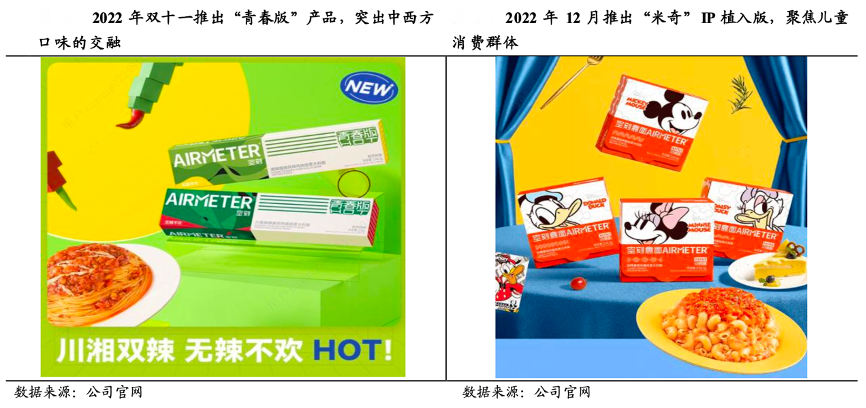 經(jīng)典案例:根據(jù)公司官網(wǎng)、國泰君安證券研究等綜合資訊表明,聚焦意面,空刻公司持續(xù)補齊自身產(chǎn)品矩陣,一方面持續(xù)發(fā)揚寶立的優(yōu)勢,不斷推出中西方口味混合的產(chǎn)品,另一方面聚焦兒童消費群體,持續(xù)在 IP 植入以及面型創(chuàng)新方面發(fā)力。