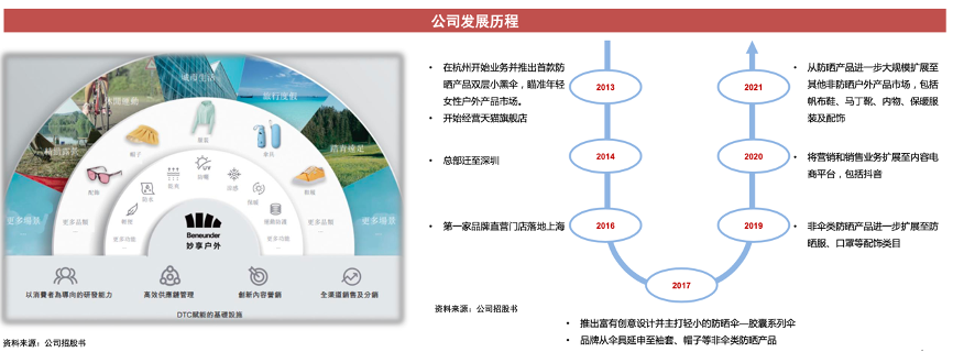 經(jīng)典案例:根據(jù)公司招股書、中信證券研究部等綜合資訊表明,蕉下是中國防曬服飾龍頭品牌,公司早期以防曬傘為起點,產(chǎn)品矩陣逐漸擴展至防曬服飾全品類。公司在中國防曬服飾中市場占有率達5%(線上市占率達13%),位居防曬服飾品牌第一。