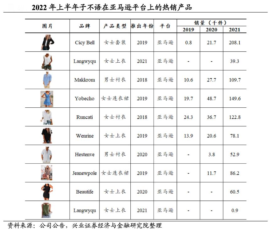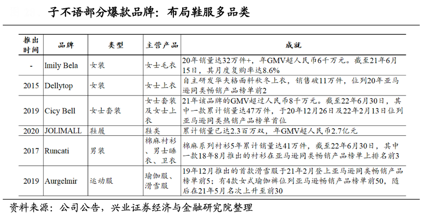 經(jīng)典案例:根據(jù)公司公告、興業(yè)證券經(jīng)濟(jì)與金融研究院等綜合資訊表明,子不語采取多品牌運(yùn)營模式,重視爆品的打造,截至 2022 年 6 月 30 日,已經(jīng)孵化有超 300 個(gè)品牌,其中有 87 家年?duì)I收超過千萬元的爆款品牌,包括女裝、男裝、鞋履、運(yùn) 動服等多種品類;。2022年上半年,子不語熱銷產(chǎn)品的營收貢獻(xiàn)達(dá)到 78.8%以上,為公司業(yè)績快速發(fā)展的主要驅(qū)動力。