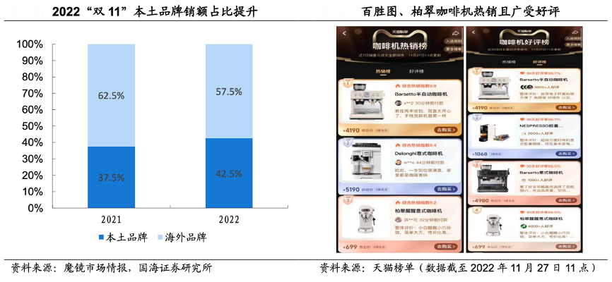 經(jīng)典案例:根據(jù)魔鏡市場(chǎng)情報(bào)、天貓榜單、國海證券研究所等綜合資訊表明,從我國咖啡機(jī)銷售表現(xiàn)來看,德龍、奈斯派索、飛利浦等中高端海外品牌占據(jù)市場(chǎng)主流,百勝圖、柏翠等高性價(jià)比的本土品牌增 長亮眼,百勝圖咖啡機(jī) 2022M6 銷額 2479 萬元(同比+605%),“雙 11”銷額 3584 萬元達(dá)到 top2;柏翠咖啡機(jī) 2022M6 銷額 1226 萬元(同比+505%),“雙 11”銷額 1569 萬元位居 top6。