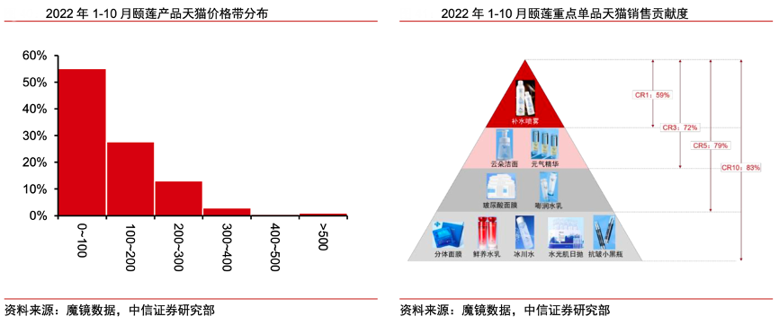 經(jīng)典案例:根據(jù)魔鏡數(shù)據(jù)、中信證券研究部等綜合資訊表明,從天貓平臺銷售來看,結合魔鏡數(shù)據(jù),頤蓮大多數(shù)銷售額來自 200 元以下價格區(qū)間。2022 年 1~10 月,從產(chǎn)品角度看,補水噴霧為頤蓮絕對大單品,2022年 1~10 月收入貢獻約 59%。