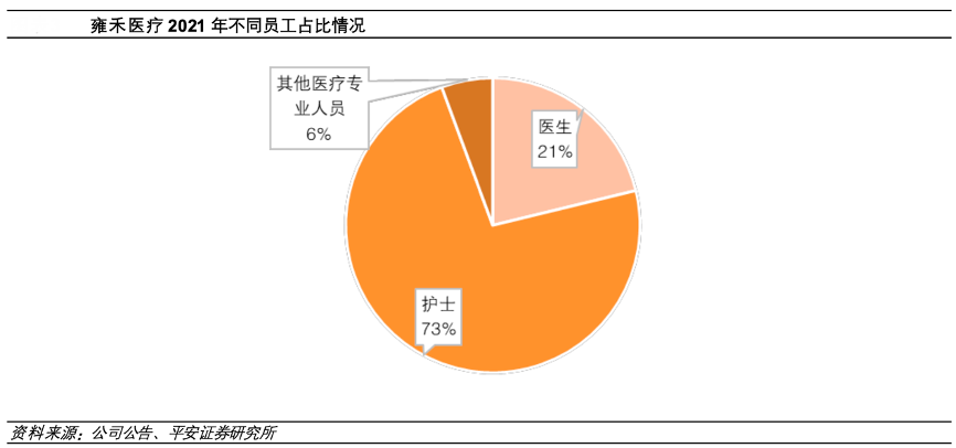 經(jīng)典案例:根據(jù)公司公告、平安證券研究所等綜合資訊表明,雍禾醫(yī)療通過手術(shù)、儀器、藥物等多種治療方式,解決患者的毛發(fā)問題。公司建立了從前后端養(yǎng)固到終端植發(fā)的全流程一站 式毛發(fā)體系。植發(fā)行業(yè)的消費(fèi)者關(guān)注術(shù)后的效果和服務(wù)質(zhì)量,醫(yī)護(hù)人員的技術(shù)與規(guī)范化管理是保證服務(wù)質(zhì)量的關(guān)鍵。雍禾醫(yī) 療作為植發(fā)行業(yè)的領(lǐng)頭機(jī)構(gòu),專業(yè)團(tuán)隊(duì)不斷擴(kuò)大,數(shù)量從 2020 年 1134 人增長(zhǎng)至 2021 年的 1221 人,其中醫(yī)生數(shù)量從 189 人 提 升至 259 人;護(hù)士數(shù)量從 901 人變?yōu)?nbsp;893 人;其他專業(yè)人員的數(shù)量從 44 增長(zhǎng)至 69 人。