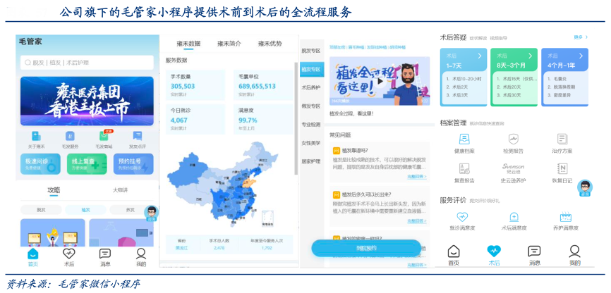 經(jīng)典案例:根據(jù)毛管家微信小程序、華創(chuàng)證券等綜合資訊表明,雍禾公司致力于推動(dòng)就醫(yī)服務(wù)標(biāo)準(zhǔn)化,在微信小程序推出毛管家小程序,除了提供科 普服務(wù)、咨詢服務(wù)、預(yù)約服務(wù)、商品購買商城等,還構(gòu)建了健康檔案管理和發(fā)友心得交 流等平臺(tái),基本搭建了從術(shù)前到術(shù)后的全流程數(shù)據(jù)管理體系。截至 2021 年 12 月,毛管 家已擁有81.1 萬名注冊(cè)用戶。