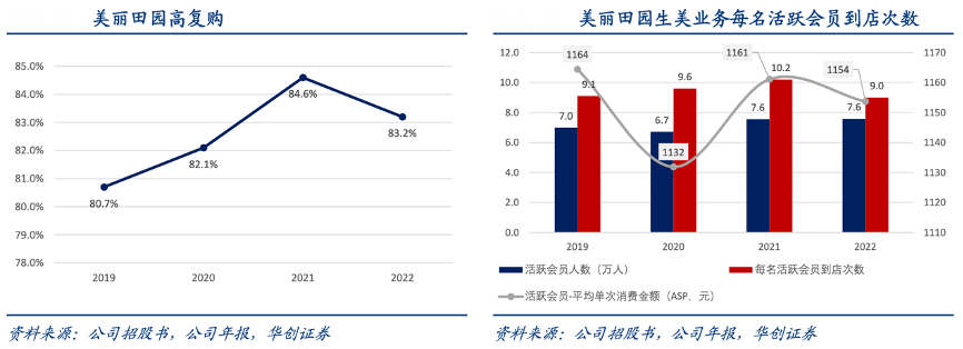 經典案例:根據公司招股書、公司年報、華創(chuàng)證券等綜合資訊表明,細致運營下,美麗田園復購率穩(wěn)定在80%+,每名活躍會員到店次數約 9~10 次,活躍會員的 ASP 約 1150 元,高于生美整體約 950 元的 ASP,舉例來看,2021 年活躍會員到店次數占比約77.6%,貢獻的收入占比約95.0%。
