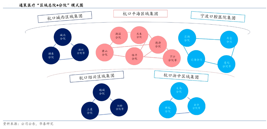 經(jīng)典案例:根據(jù)公司公告、華泰研究等綜合資訊表明,通策醫(yī)療公司在浙江省內(nèi)已擁有杭口平海、杭口城西、 寧波口腔、杭口紹興、杭口浙中 5 家口腔區(qū)域集團(tuán),并由此擴(kuò)張分院,形成多個(gè)“區(qū)域總 院+分院”醫(yī)院集群。相比行業(yè)內(nèi)絕大多數(shù)公司采用的“平行連鎖診所”的擴(kuò)張模式,公司 “區(qū)域總院+分院”的商業(yè)模式對(duì)旗艦醫(yī)院的稟賦、資源及機(jī)遇等要求更高,復(fù)制難度更大。