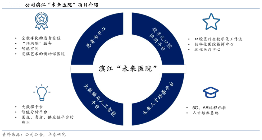 經(jīng)典案例:根據(jù)公司公告、華泰研究等綜合資訊表明,紫金港醫(yī)院是通策醫(yī)療公司重點(diǎn)布局的頭面部醫(yī)學(xué)中心,其定位以口腔醫(yī)療服務(wù)為主,兼有疾病預(yù)防、保健、科研、教學(xué)等多種功能,而濱江未來(lái)醫(yī)院亦為公司完善杭州區(qū)域布局的重點(diǎn)項(xiàng)目,其以未來(lái)口腔醫(yī)院為標(biāo)準(zhǔn)進(jìn)行建設(shè),從客戶(hù)的預(yù)約、復(fù)診、就診路線(xiàn)等就診的各個(gè)環(huán)節(jié)都將實(shí)現(xiàn)數(shù)字信息化,并借助大數(shù)據(jù)平臺(tái)及人工智能平臺(tái),為醫(yī)院運(yùn)營(yíng)情況及客戶(hù)診療結(jié)果提供綜合分析,該院建成后將新增牙椅 43 張。