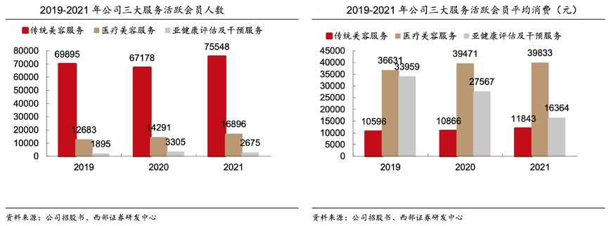 經(jīng)典案例:根據(jù)公司招股書、西部證券研發(fā)中心等綜合資訊表明,高客流量及出色的運營使美麗田園公司得以建立龐大的會員庫,并且活躍會員人數(shù)龐大,消費能力高且粘性較高。2019年、2020年及2021年,公司活躍會員中的 80.7%、82.1%及 84.6%分別于當年多次購買了公司服務。按活躍會員平均消費來看,公司傳統(tǒng)美容服務的活躍會員平均消費金額超過 1 萬元,醫(yī)療美容服務活躍會員平均消費金額接近 4 萬元,均在業(yè)內(nèi)處于較高水平。