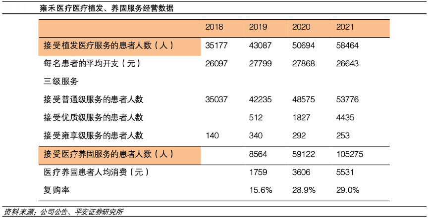 經(jīng)典案例:根據(jù)公司公告、平安證券研究所等綜合資訊表明,通過(guò)全產(chǎn)業(yè)鏈的服務(wù)體系以及醫(yī)護(hù)人員服務(wù)能力的提升,雍禾醫(yī)療的患者人數(shù)不斷增加。接受植發(fā)醫(yī)療服務(wù)的患者人數(shù)從 2018 年 35177 人增長(zhǎng)至 2021 年 58464 人,3 年的復(fù)合增長(zhǎng)率為 18.45%;接受醫(yī)療養(yǎng)固服務(wù)的患者人數(shù)從 2019 年的 8564 人增長(zhǎng)至 2021 年的 105275 人,復(fù)合增速達(dá)到 250.61%。