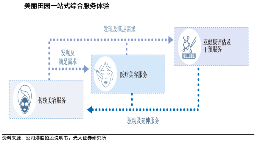 經(jīng)典案例:根據(jù)公司港股招股說(shuō)明書(shū)、光大證券研究所等綜合資訊表明,美麗田園2021-1H2022 期間,分別有21.7%及 21.2%的傳統(tǒng)美容服務(wù)會(huì)員購(gòu)買(mǎi)了醫(yī)療美 容服務(wù)或亞健康評(píng)估及干預(yù)服務(wù)。除生活美容會(huì)員向醫(yī)美服務(wù)及亞健康評(píng)估及干預(yù)服務(wù)轉(zhuǎn)介,醫(yī)美及亞健康服務(wù)的術(shù)前術(shù)后均存在日常護(hù)理和修復(fù)維穩(wěn)的需求,借此向生活美容業(yè)務(wù)導(dǎo)流,提高生活美容消費(fèi)頻次。