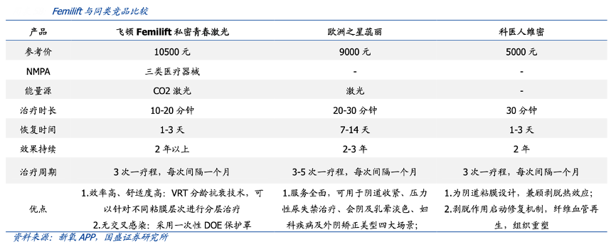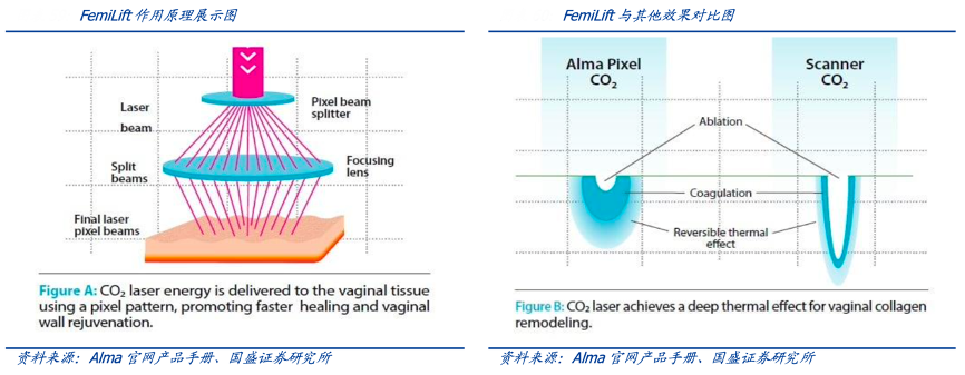經(jīng)典案例:根據(jù)Alma官網(wǎng)產(chǎn)品手冊、國盛證券研究所等綜合資訊表明,F(xiàn)emiLift 聚焦女性私密美容,通過獨特的長波脈沖,并利用 CO2 點陣激光來實現(xiàn)傳遞更高的能量。與同類產(chǎn)品相比,F(xiàn)emilift 由于獨有的 VRT 技術(shù),具備治療效率高、舒適度高等優(yōu)點,單次治療 時長通常僅需 15min,且由于療程采用一次性 DOE 保護罩,無交叉感染風(fēng)險。