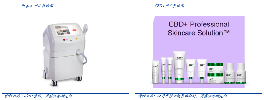經(jīng)典案例:根據(jù)Alma官網(wǎng)、公司年報業(yè)績展示材料、國盛證券研究所等綜合資訊表明,REJUVE、REMOVE、SPADEEP 等產(chǎn)品系列,相較于無創(chuàng)醫(yī)美線設備,搭載的激光技術(shù)更為安全、穩(wěn)定,在治療過程中表現(xiàn)為操作簡易、不易造成熱損傷,專為美容院等 B 端客戶提供,可用于提拉緊致、凈膚嫩膚、脫毛等治療。其中 REJUVE 作為一種高效的嫩膚解決方案,已在全球 6500 多家診所成功使用。公司于 2022 年內(nèi)還推出了 CBD+專業(yè)皮膚護理方案,CBD+是首個結(jié)合全光譜大麻二酚系統(tǒng)優(yōu)勢的專業(yè)護膚解決方案,能顯著改善皮膚發(fā)紅并舒緩敏感肌膚表層,主要作為搭配耗材,于能量源設備治療后使用。