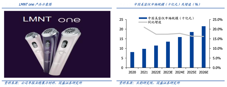 經(jīng)典案例:根據(jù)頭豹研究院、公司年報業(yè)績展示材料、國盛證券研究所等綜合資訊表明,復(fù)銳醫(yī)療科技公司于2022 年 3 月 2 日推出全新品牌 LMNT,隨后推出首款家用 美容儀器 LMNT One。LMNT One基于紅光和紅外光療法,結(jié)合兩種獨(dú)特激光波長 NIR 830nm 和 630nm 的功率,利用協(xié)調(diào)微脈沖實現(xiàn)嫩膚、提升皮膚彈性和促進(jìn)膠原蛋白再生等效果。