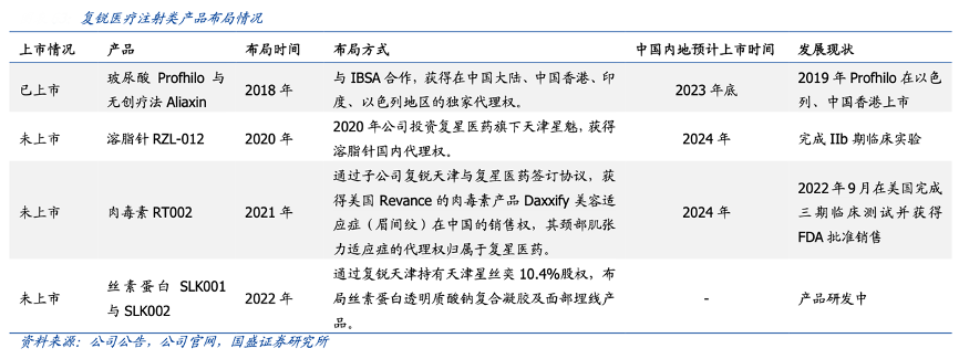經(jīng)典案例:根據(jù)公司公告、公司官網(wǎng)、國盛證券研究所等綜合資訊表明,復(fù)銳醫(yī)療科技公司在原有能量醫(yī)美產(chǎn)業(yè)的基礎(chǔ)上,2019 年把握市場風(fēng)向積極開拓全新注射醫(yī)美市場。目前公司通過借助 Alma 和復(fù)星醫(yī)藥兩大平臺,合作 與國際先進(jìn)企業(yè)的投資和合作布局了玻尿酸、溶脂針、肉毒素和絲素蛋白等重要領(lǐng)域,現(xiàn)玻尿酸產(chǎn)品 Profhilo 已上市。