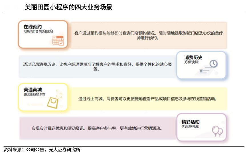 經(jīng)典案例:根據(jù)公司公告、光大證券研究所等綜合資訊表明,2022年美麗田園公司的數(shù)字化建設(shè)在門店運(yùn)營(yíng)管理系統(tǒng)、美田在線小程序、企業(yè)微信客戶管理等 10 個(gè)重要方面實(shí)現(xiàn)了研發(fā)迭代。2020 年初公司即上線了小程序,覆蓋在線預(yù)約,消費(fèi)歷史、美遇商城與精彩活動(dòng)四大業(yè)務(wù)場(chǎng)景,實(shí)現(xiàn)顧客在線預(yù)約和消費(fèi)的閉路循環(huán),讓消費(fèi)者更便捷了解美麗田園服務(wù)信息。通過(guò)完善的數(shù)據(jù)系統(tǒng),截至 2022 年末,公司已積累 96 項(xiàng)客戶的標(biāo)簽。