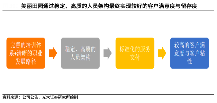 經(jīng)典案例:根據(jù)公司公告、光大證券研究所等綜合資訊表明,美麗田園的服務(wù)人員擁有豐富的從業(yè)經(jīng)驗(yàn),截至2022 年末,在公司工作超過(guò)一年的服務(wù)人員的平均從業(yè)經(jīng)驗(yàn)為 6.1 年,遙遙領(lǐng)先于市場(chǎng)平均水平。另外,2022年公司專業(yè)服務(wù)人員的年度留任率達(dá)到74%。