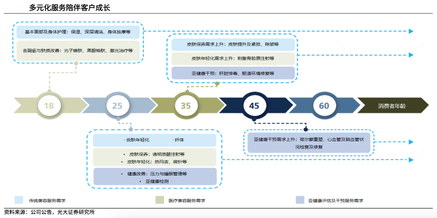 經典案例:根據(jù)公司公告、光大證券研究所等綜合資訊表明,美麗田園以“雙美”模式打造流量閉環(huán),私域轉介降低銷售費用。其通過傳統(tǒng)美容服務初步贏得客戶信任,進而延伸至醫(yī)療美容服務以及亞健康評估及干預服務等服務,多元化服務涵蓋 47 類服務項目及超過 800 個 SKU,陪伴客戶的成長。