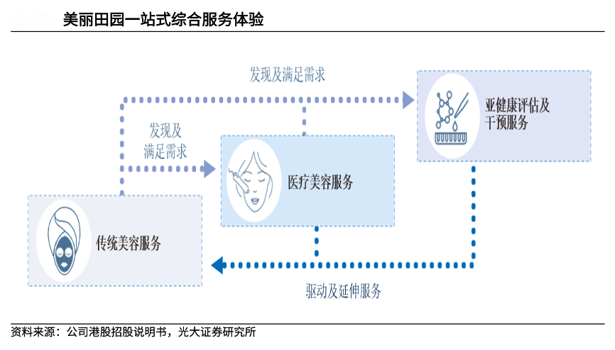經典案例:根據(jù)公司港股招股說明書、光大證券研究所等綜合資訊表明,美麗田園2021-1H2022 期間,分別有21.7%及 21.2%的傳統(tǒng)美容服務會員購買了醫(yī)療美 容服務或亞健康評估及干預服務。除生活美容會員向醫(yī)美服務及亞健康評估及干預服務轉介,醫(yī)美及亞健康服務的術前術后均存在日常護理和修復維穩(wěn)的需求,借此向生活美容 業(yè)務導流,提高生活美容消費頻次。