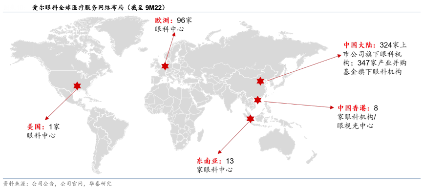 經(jīng)典案例:根據(jù)公司公告、公司官網(wǎng)、華泰研究等綜合資訊表明,愛爾眼科作為全球性眼科連鎖醫(yī)療機構(gòu),服務(wù)網(wǎng)絡(luò)遍布海內(nèi)外,截至 9M22,集團(tuán)旗下機構(gòu)數(shù)合計已達(dá) 789 家。截至 9M22,中國大陸共有 671 家眼科機構(gòu),其中上市公司旗下 324 家(其中眼科醫(yī)院 187 家,門診部 137 家),體外并購基金旗下 347 家(其中眼科醫(yī)院 312 家,門診部 35 家)。
