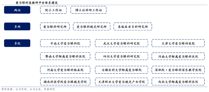 經(jīng)典案例:根據(jù)公司公告、公司官網(wǎng)、華泰研究等綜合資訊表明,愛爾眼科公司自 2013 年與中南大學(xué)聯(lián)合成立中南大學(xué)愛爾眼科學(xué)院后,其陸續(xù)推動了與湖北科技學(xué)院、武漢大學(xué)、暨南大 學(xué)、安徽醫(yī)科大學(xué)、天津大學(xué)、四川大學(xué)等知名高校的戰(zhàn)略合作,公司目前已形成了以“多院”“多所”“兩站”為核心的醫(yī)教研體系,不斷為集團(tuán)輸出優(yōu)質(zhì)的眼科/眼視光醫(yī)生資源并提供良好的培養(yǎng)/培訓(xùn)平臺。