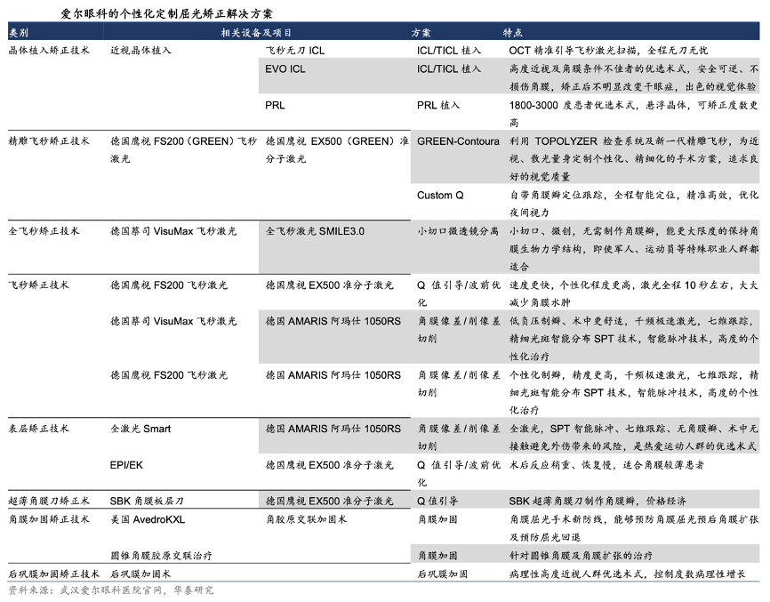 經(jīng)典案例:根據(jù)公司官網(wǎng)、華泰研究等綜合資訊表明,愛爾眼科公司作為國內(nèi)民營眼科診療服務(wù)領(lǐng)軍者,持續(xù)引領(lǐng)屈光手術(shù)相關(guān)先進(jìn)技術(shù)在國內(nèi)的導(dǎo)入和應(yīng)用;比如公司在 2005 年率先在國內(nèi)引入飛秒激光技術(shù),在 2013 年率先批量引進(jìn)全飛秒激光手術(shù)系統(tǒng),在 2014 年又成為國內(nèi)首批開展中央孔型 ICL 植入術(shù)的醫(yī)療機(jī)構(gòu)。