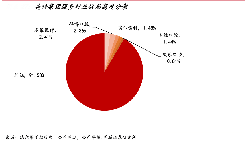 經(jīng)典案例:根據(jù)瑞爾集團(tuán)招股書、公司網(wǎng)站、公司年報、國聯(lián)證券研究所等綜合資訊表明,由于我國民營口腔業(yè)態(tài)以診所為主,且口腔診所投入資本、監(jiān)管、運營等要求較低,部分在行業(yè)內(nèi)稍有影響力的牙醫(yī)會選擇開辦個體診所,因為格局較為分散,CR5 僅為 8.5%。其中瑞爾集團(tuán)排名第三,市占率為 1.48%。