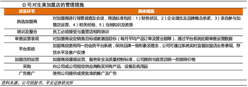 經(jīng)典案例:根據(jù)公司招股書、平安證券研究所等綜合資訊表明,美麗田園公司僅生美業(yè)務(wù)開放高門檻加盟,其對加盟商管控嚴(yán)格,要求加盟商嚴(yán)格保持品牌統(tǒng)一形象、使用公司統(tǒng)一的會員平臺系統(tǒng)、僅可向公司購買產(chǎn)品與設(shè)備、與直營店統(tǒng)一的價格指導(dǎo),且所有銷售經(jīng)營活動進(jìn)入公司 POS 系統(tǒng),公司對加盟店進(jìn)行定期巡查。公司生美業(yè)務(wù)引入加盟已經(jīng)超過 15 年,助力加速擴(kuò)展門店網(wǎng)絡(luò)、吸引客戶及區(qū)域滲 透,2022 年公司直營+加盟活躍會員數(shù)達(dá)到 10.82 萬人,其中加盟店活躍會員數(shù) 2.99 萬人,占比 28%。