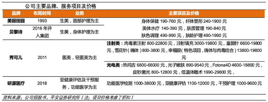 經(jīng)典案例:根據(jù)公司招股書、平安證券研究所等綜合資訊表明,截止目前,美麗田園公司提供約47類美麗與健康服務(wù),生美、醫(yī)美、健康服務(wù) SKU 總數(shù)超 800 個,分品牌服務(wù)消費者。