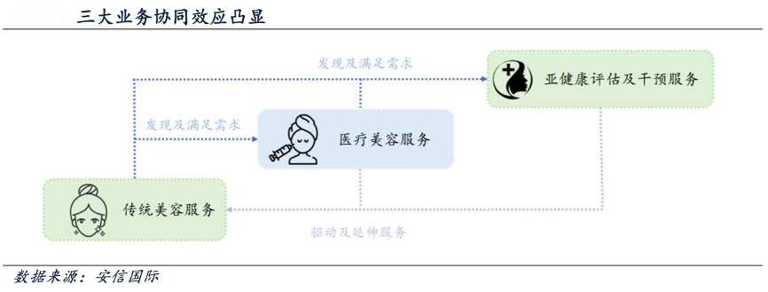 經(jīng)典案例:根據(jù)安信國際等綜合資訊表明,美麗田園公司通過傳統(tǒng)美容服務獲客,延伸至更復雜且專業(yè)的醫(yī)療美容服務以及亞健康評估及干預服務,發(fā)揮最大協(xié)同效應,從而提升客戶留存率和提高客戶消費水平。2022 年23.7%的傳 統(tǒng)美容服務會員購買了醫(yī)療美容服務或亞健康評估及干預服務,較 2021 年上漲 2 個百分點。