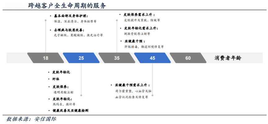 經(jīng)典案例:根據(jù)安信國(guó)際等綜合資訊表明,美麗田園公司主營(yíng)傳統(tǒng)美容服務(wù)業(yè)務(wù),自 2011 年起進(jìn)軍醫(yī)療美容服務(wù),打開(kāi)第二條成長(zhǎng)曲線,2018 年開(kāi)始發(fā)展亞健康評(píng)估及干預(yù)服務(wù),開(kāi)拓未來(lái)增長(zhǎng)的第三大支柱。公司提供多樣化美麗與 健康管理服務(wù),涵蓋 47 類服務(wù)項(xiàng)目及超過(guò) 800 個(gè) SKU,跨越客戶全生命周期。