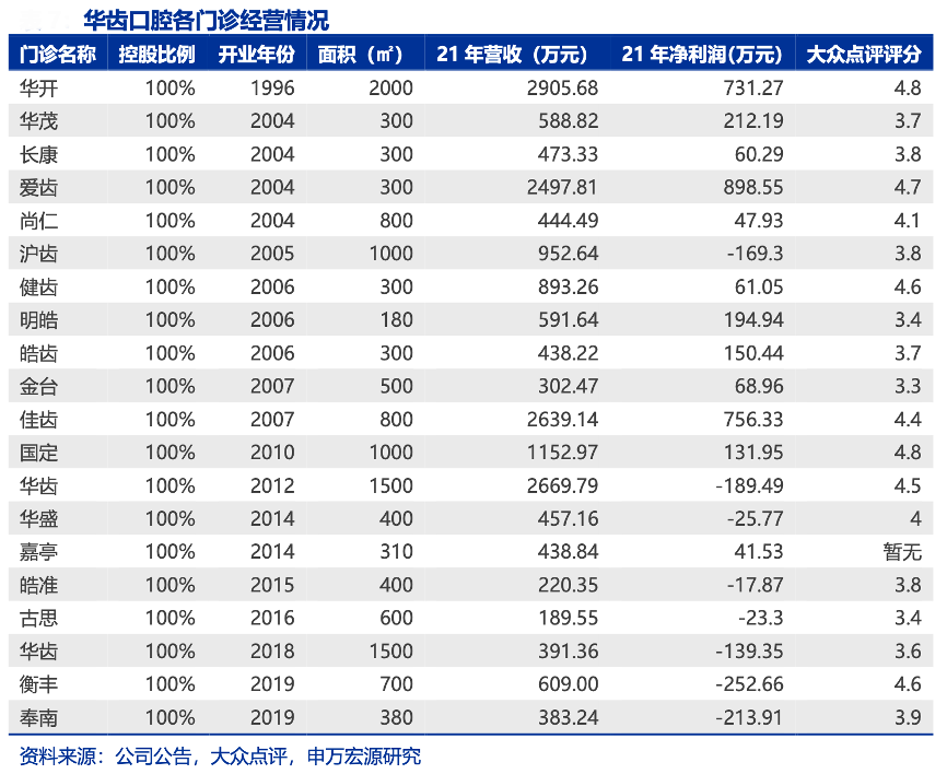經(jīng)典案例:根據(jù)大眾點(diǎn)評、公司公告、申萬宏源研究等綜合資訊表明,華齒口腔公司 20 家門診的大眾點(diǎn)評平均評分為 4.05,高于瑞爾齒科(3.5,14 家),拜博口腔(3.88,37 家) 等其他上海地區(qū)頭部齒科企業(yè)。此外,公司不乏像華開,佳齒這樣的區(qū)域老牌口碑店,它們有著長期的經(jīng)營歷史以及優(yōu)秀的盈利能力,積攢了大量的高依賴度客源與優(yōu)秀的口碑。