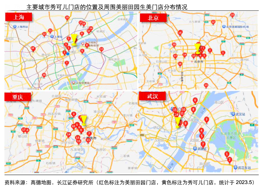 經(jīng)典案例:根據(jù)高德地圖、長江證券研究所等綜合資訊表明,以美麗田園旗下的秀可兒醫(yī)美在北京、上海、重慶、武 漢的門店布局為例,生美門店緊密圍繞秀可兒門店錯(cuò)落排布,在偏高端的生美定位與醫(yī)美用戶的客群定位高度契合下,從生美獲客并引流至醫(yī)美,生美客戶高粘性增強(qiáng)消費(fèi)者信任感,選址相近提高品牌識(shí)別度,或能有效降低醫(yī)美獲客成本,提高醫(yī)美機(jī)構(gòu)利潤率。