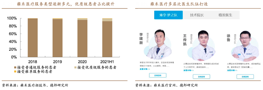 經(jīng)典案例:根據(jù)雍禾醫(yī)療招股書、雍禾醫(yī)療官網(wǎng)、德邦研究所等綜合資訊表明,雍禾醫(yī)療公司提供三級(jí)根據(jù)醫(yī)生經(jīng)驗(yàn)及技能加以區(qū)分的植發(fā)醫(yī)療服務(wù),包括:1)普通級(jí)服務(wù):針對(duì)接 受標(biāo)準(zhǔn)植發(fā)手術(shù)的患者,收取人民幣 2 萬元至 3 萬元;2)優(yōu)質(zhì)級(jí)服務(wù):針對(duì)院長、主任或副主任進(jìn)行升級(jí)和定制化植發(fā)手術(shù)的患者,收取 3 萬元至 5 萬元;3)貴賓級(jí)雍享服務(wù):針對(duì)接受由業(yè)內(nèi)知名植發(fā)專家進(jìn)行個(gè)性化植發(fā)手術(shù)的患者,收取逾 10 萬元。