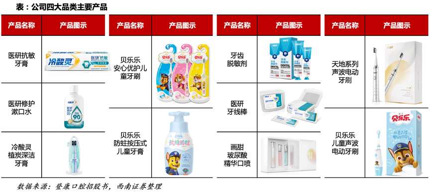 經(jīng)典案例:根據(jù)登康口腔招股書(shū)、西南證券等綜合資訊表明,重慶登康口腔護(hù)理用品股份有限公司主要從事口腔護(hù)理用品的研發(fā)、生產(chǎn)與銷(xiāo)售,主要產(chǎn)品涵蓋成人基礎(chǔ)口腔護(hù)理產(chǎn)品、兒童基礎(chǔ)口腔護(hù)理產(chǎn) 品、口腔醫(yī)療與美容護(hù)理產(chǎn)品以及電動(dòng)口腔護(hù)理產(chǎn)品四大類(lèi)。公司旗下?lián)碛?ldquo;登康”“冷酸靈”等知名口 腔護(hù)理品牌,以及高端專(zhuān)業(yè)口腔護(hù)理品牌“醫(yī)研”、兒童口腔護(hù)理品牌“貝樂(lè)樂(lè)”、高端嬰童口腔護(hù)理品 牌“萌芽”,為各年齡段消費(fèi)人群提供專(zhuān)業(yè)化、個(gè)性化的高品質(zhì)口腔護(hù)理用品。