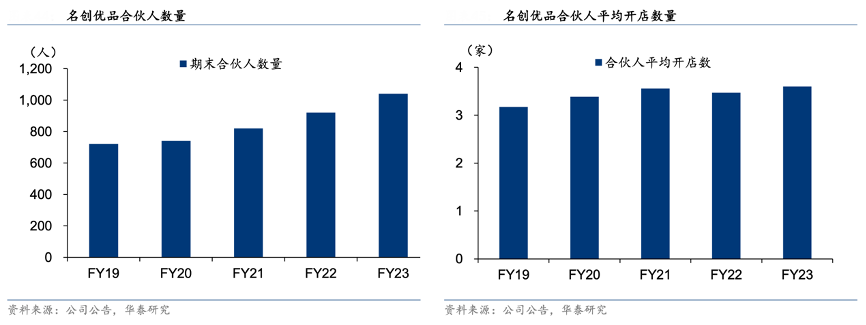 經(jīng)典案例:根據(jù)公司公告、華泰研究等綜合資訊表明,名創(chuàng)優(yōu)品品牌與合伙人形成長久牢固的合作關(guān)系。FY2019 至 FY2023,名創(chuàng)優(yōu)品合伙人從 721 人增至 1,040 人,平均每名合伙人開店數(shù)量從 3.2 家增長至 3.6 家。截至 2023 年 6 月 30 日,名創(chuàng)優(yōu)品 860 個合伙人中有有 550 個合伙人投資名創(chuàng)優(yōu)品加盟店超過 3 年。