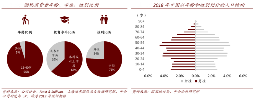 經(jīng)典案例:根據(jù)公司公告、Frost&Sullivan、上海浦東微熱點大數(shù)據(jù)研究院、國家統(tǒng)計局、中金公司研究部等綜合資訊表明,潮流玩具主要用戶定位為 15-40 歲的年輕、高消費群體,其中又以女性為更加主力的消費群體。結(jié)合上海浦東微熱點大數(shù)據(jù)研究院 2019 年數(shù)據(jù),在關(guān)注盲盒的人群中女性占比為 75.8%。根據(jù)國家統(tǒng)計局數(shù)據(jù),2018 年國內(nèi)總?cè)丝?nbsp;13.95 億,其中 15-39 歲女性人數(shù)為 2.32 億人(占比 16.7%)。截至 2020 年 6 月,泡泡瑪特作為潮玩行業(yè)龍頭企業(yè),注冊會員數(shù)為 360 萬人,潛在市場空間仍然較大。