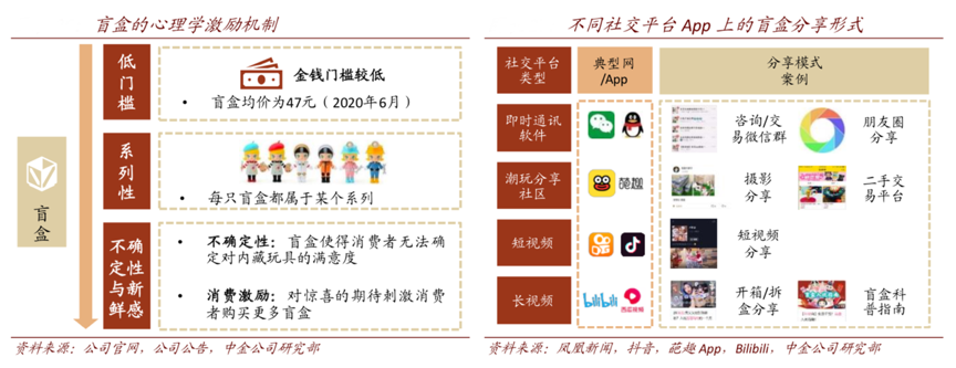 經(jīng)典案例:根據(jù)公司官網(wǎng)、公司公告、鳳凰新聞、抖音、葩趣APP、Bilibili、中金公司研究部等綜合資訊表明,泡泡瑪特公司巧妙結(jié)合盲盒模式刺激購買欲,激發(fā)潮玩愛好者消費熱情,并采用線上App、會員 權(quán)益、粉絲運營等方式激活盲盒社交價值和收藏價值,形成良好的產(chǎn)品和圈層生態(tài),提高消費者購買意愿和忠誠度。
