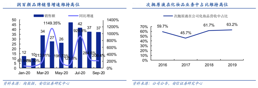 經(jīng)典案例:根據(jù)淘數(shù)據(jù)、公司公告、安信證券研究中心等綜合資訊表明,結(jié)合天貓旗艦店公開數(shù)據(jù),潤百顏次拋原液累計賣出 1.12 億支(以 2019 年年報披露的單價 9.2 元/支計算約合 10.3 億人民幣),2018年以來在其公司化妝品業(yè)務(wù)營收中占比超過 60%,次拋原液產(chǎn)品賣點為“次拋包裝+玻尿酸原液”,具備專利玻尿酸分子技術(shù),極具“大單品”雛形。