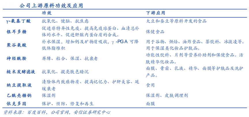 經(jīng)典案例:根據(jù)百度百科、公司官網(wǎng)、安信證券研究中心等綜合資訊表明,華熙生物依托微生物發(fā)酵平臺及產(chǎn)業(yè)化優(yōu)勢,可開發(fā)出多種活性物質(zhì),目前包括γ-氨基丁酸、銀耳多糖、聚谷氨酸、神經(jīng)酰胺、糙米發(fā)酵濾液、納豆提取液、乙酰殼糖鈉、依克多因等多元生物活性物質(zhì)產(chǎn)品已開發(fā)上市,有望在功能性護膚品領(lǐng)域得到進一步應(yīng)用。
