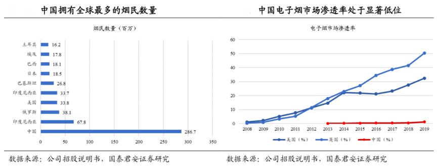 經(jīng)典案例:根據(jù)公司招股說明書、國泰君安證券研究等綜合資訊表明,近年來美國、英國、中國的電子煙使用者滲透率均保持持續(xù)增長,分別從 2014 年的 22.1%/22.9%/0.2%增長至 2019 年的 32.4%/50.4%/1.2%,中國煙民數(shù)量眾多而 電子煙使用比例較小,中國的電子煙市場具有極大的發(fā)展?jié)摿?。隨著國內(nèi)煙民健康意識的提高,煙草市場對于高品質(zhì)、低焦油煙草制品的需求將愈發(fā)旺盛,帶動電子煙市場的迅速成熟。