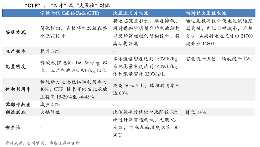 經(jīng)典案例:根據(jù)公司公告、華安證券研究所等綜合資訊表明,傳統(tǒng)的電池包是由電芯和金屬蓋板端板、線束、粘合劑、導(dǎo)電膠、模組控制單元等部件組合形成一個(gè)電池模組,再由模組構(gòu)成電池包(Pack)。電池的技術(shù)不光在于材料體系,從電芯到模組到 PACK 層面的設(shè)計(jì)都有很大的差異化和發(fā)展空間。無論是特斯拉的“無極耳”、 “大圓柱”,還是比亞迪的“刀片”和寧德時(shí)代的“CTP”,均為結(jié)構(gòu)上的設(shè)計(jì)變化。