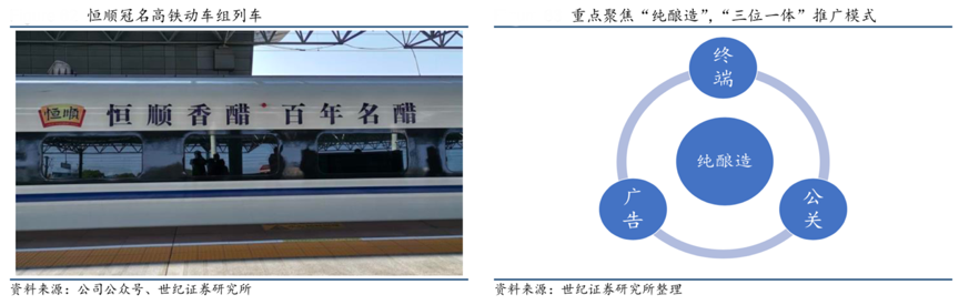 經(jīng)典案例:根據(jù)公司公眾號(hào)、世紀(jì)證券研究所等綜合資訊表明,恒順加快了與新華社、央視央廣、高鐵媒體等知名媒體與網(wǎng)絡(luò)平臺(tái)合作, 2018年其加入中國(guó)高鐵城市品牌計(jì)劃,與上海、武漢、濟(jì)南三大鐵路局合作冠名“恒順醋業(yè)號(hào)”高鐵列車,擴(kuò)大華東、華北、華中等重點(diǎn)區(qū)域品牌宣傳力度。同時(shí)恒順公司計(jì)劃進(jìn)一步加大品牌宣傳覆蓋力度,將在廣告業(yè)務(wù)宣傳方面投入 1 億 元,約占收入5%,核心圍繞“純釀造”特色,通過終端、公關(guān)、廣告“三位一體”的模式進(jìn)行品牌推廣。