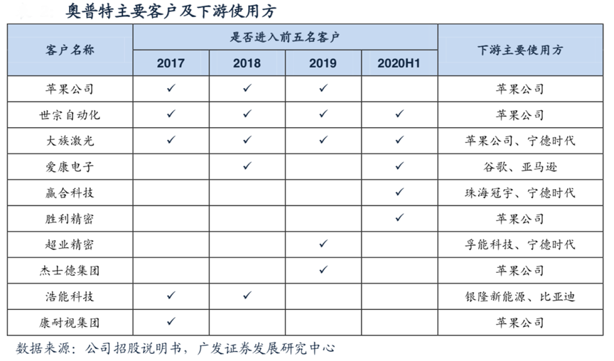 經典案例:根據公司招股說明書、廣發(fā)證券研究中心等綜合資訊表明,2017年至2020年1-6月,奧普特公司前五名客戶保持穩(wěn)定,以設備制造商客戶為主, 下游使用方以蘋果產業(yè)鏈及鋰電池產業(yè)鏈為主。2017年至2020年1-6月,蘋果公司及其指定第三方收入占公司主營業(yè)務收入的比例分別為17%、27%、39%和19%。