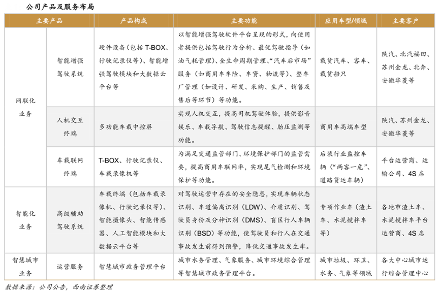 經(jīng)典案例:根據(jù)公司公告、西南證券等綜合資訊表明,智能化與網(wǎng)聯(lián)化是鴻泉物聯(lián)公司的主要業(yè)務(wù)體系,共同服務(wù)商用車前后裝市場(chǎng)。其目前主要業(yè)務(wù)為汽車智能網(wǎng)聯(lián)設(shè)備的研發(fā)、生產(chǎn)和銷售。緊密圍繞智能網(wǎng)聯(lián)汽車的兩大技術(shù)路徑,主要產(chǎn)品包括代表智能化技術(shù)路徑的高級(jí)輔助駕駛系統(tǒng)和代表網(wǎng)聯(lián)化技術(shù)路徑的智能增強(qiáng)駕駛 系統(tǒng)、人機(jī)交互終端、車載聯(lián)網(wǎng)終端。