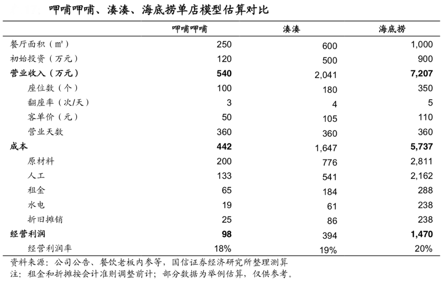 經(jīng)典案例:根據(jù)公司公告、餐飲老板內(nèi)參、國信證券經(jīng)濟研究所等綜合資訊表明,呷哺呷哺定位“一人一鍋”臺式小火鍋,目標(biāo)客群為 95 后群體,單店面積小、初始投入小,成熟后單店收入規(guī)模在三者中也最小。海底撈定位傳統(tǒng)火鍋,就餐場景和覆蓋人群相比呷哺呷哺和湊湊都更為豐富,門店空間也最大。