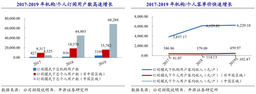 經(jīng)典案例:根據(jù)公司招股說明書、開源證券研究所等綜合資訊表明,福昕軟件公司訂閱收入的高速增長得益于客戶數(shù)量的快速增長及客單價的提升。其機構(gòu)/個人訂閱客戶數(shù)量快速增長。2017-2019年其 機構(gòu)客戶數(shù)量分別為427 戶、 816 戶和 3,199 戶,分別增長 91.10%和 292.03%。隨著公司知名度的提升及公司對中國市場的開拓,非中國區(qū)域與中國區(qū)域的個人客戶數(shù)量均實現(xiàn)較快增長。